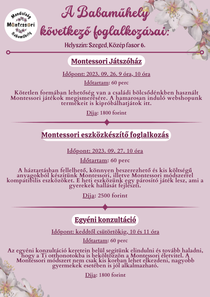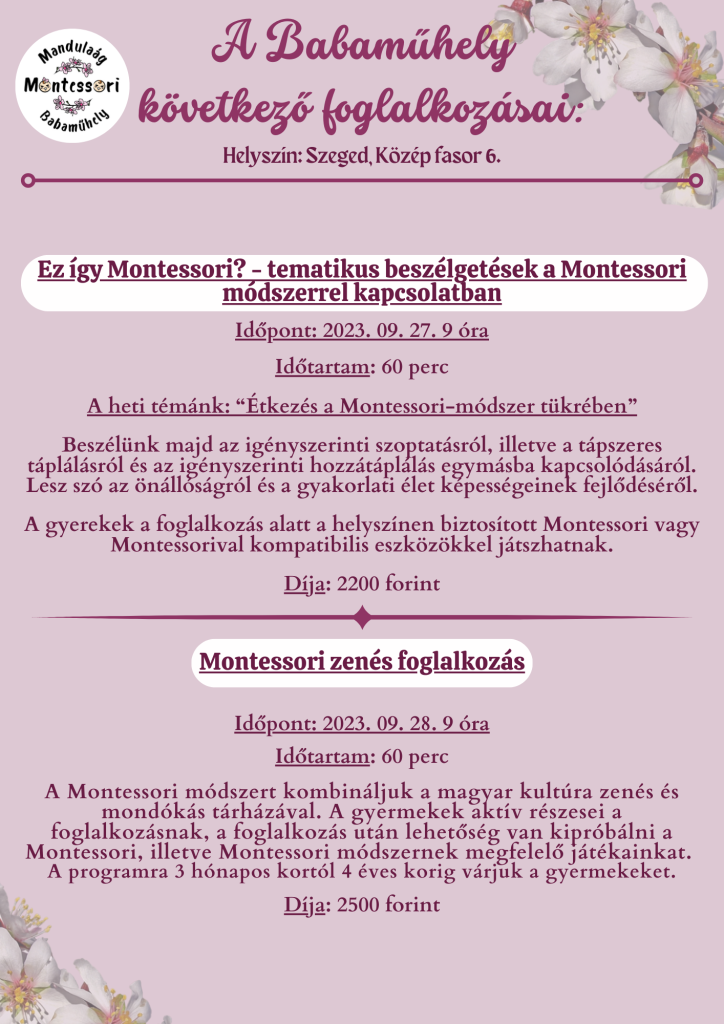 Várunk Benneteket szeretettel e heti programjainkon is. Bejelentkezni a babamuhely[at]mandulaagmontessori.hu e-mail címen tudtok. :)
