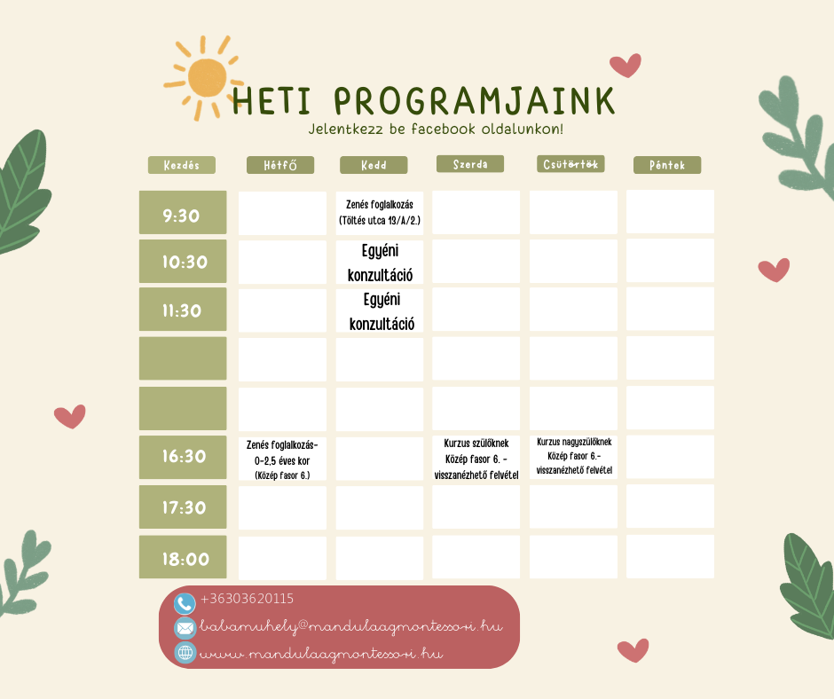 Jövő héten is várunk Benneteket a Babaműhelyben 🙂! 🔸Hétfőn délután 🎶Montessori zenés foglalkozásunkra🎵 várjuk a 3 év alatti gyermekeket és szüleiket bölcsi vagy a délutáni alvásidejüket követően a Közép fasor 6. szám alatt. 🔸Kedden délelőtt a reggel aktív babákat várjuk szintén 🎶Montessori zenés foglalkozásra🎵 a Töltés utca 13/A 2. szám alatt. 🔸Szerdán indul szülőknek szóló kurzusunk, melyről felvétel készül, így később visszanézhetőek, hogy se a távolság, se az időpont ne legyen akadály az érdeklődők számára 🙂. Helyszínen részt vevőket a Közép fasor 6. szám alatt várjuk. Bérlet váltható elővételben online a honlapunkon és a helyszínen. 🔸Csütörtökön indul nagyszülőknek szóló kurzusunk, melyről felvétel készül, így később visszanézhetőek, hogy se a távolság, se az időpont ne legyen akadály az érdeklődők számára 🙂. Helyszínen részt vevőket a Közép fasor 6. szám alatt várjuk. Bérlet váltható elővételben online a honlapunkon és a helyszínen. 🔸Kedden délelőtt lehetőségetek van egyéni konzultációs időpontot foglalni. Várunk Benneteket szeretettel! 🙂