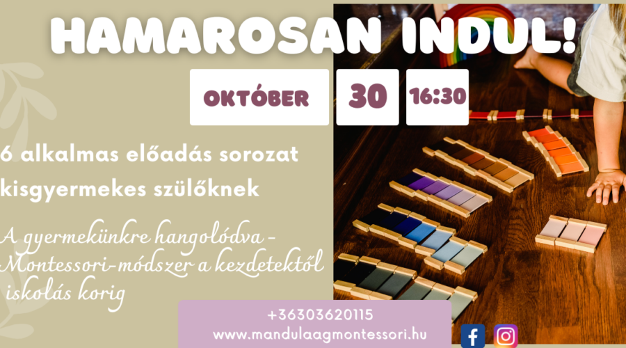 2024.10.30-án 16:30-kor elindítjuk szülőknek szóló 6 alkalmas kurzusunkat. A kurzust Zölei-Szénási Ráhel a Mandulaág Montessori Családi Bölcsőde vezetője, NAMC diplomás Montessori pedagógus tartja.6 alkalmas szülői …