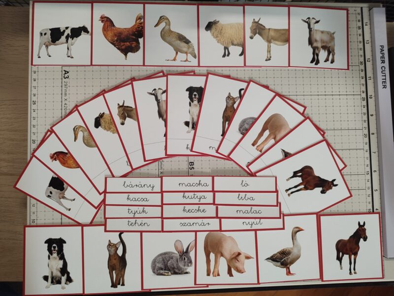 Nomenklatúra kártyáinkon, igazodva a betűkkel való iskolai megismerkedés sorrendjéhez, írott betűkkel készültek a magyar nyelvű feliratok. A kártyák kontroll készlete 1,5 éves kortól, míg a teljes szett óvodás kortól ajánlott. Az eszköznek nem az olvasás a fő célja, hanem a szókincs és a vizuális diszkriminancia fejlesztése (a látottak megkülönböztetésére való képesség, egyes elemek vizuális elkülönítésének képessége), mely alapvető fontosságú a későbbi sikeres írás- és olvasástanuláshoz. Olvasási nehézségek esetén is hasznosak lehetnek ezek a kártyák. Ez a nomenklatúra kártya szettünk 12 állatot foglal magába, nyomdai minőségben készül.